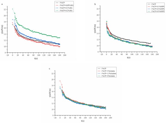 The influence of different hydrocolloids on the adsorption of coconut protein on the oil–water interface is shown in Figure 6. First, when t = 0, the γ value is less than that of pure water, indicating that the system has good surface activity. As time goes by, all samples show a trend of decreasing interfacial tension. In the early stage of adsorption, the interfacial tension decreases rapidly after the mixture is dripped into the oil, and the rate of decrease in the late stage of adsorption is relatively slow [].