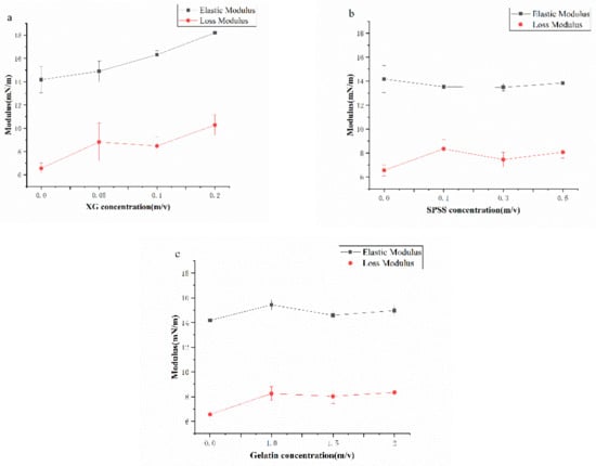 The elastic modulus and viscous modulus of the interface expansion rheological properties are shown in the Figure 7. It can be seen that the value of the elastic modulus is much larger than the viscous modulus, indicating that the coconut protein interface films is mainly elastic. As the polysaccharide concentration increases, the elastic modulus increases, and the elastic characteristics of the interface films also increase. The phenomenon of adding XG is more significant, which shows that the addition of XG increases the viscoelasticity of the coconut protein interface films [], and the protein value adsorbed on the oil/water interface is mainly elastic in the interface films structure. Because XG is an anionic non-adsorbent polysaccharide, it will not compete with the protein on the interface. The changes in this system indicate that XG participates in the formation and development of the interface film, which may be due to the electrostatic interaction between macromolecules increasing the expansion modulus of the interface film.