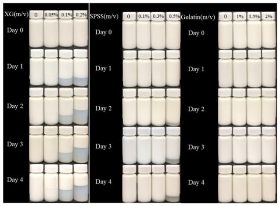 Figure 8 shows the storage images of three emulsion systems at 25 °C. It can be seen directly from the figure that the storage stability of the emulsion with XG is decreased, while the stability of the coconut protein emulsion without XG is better. After adding a high concentration of XG, serious delamination occurred after 1 day, forming a transparent lower layer. This shows that as the concentration of XG increases, the content of unadsorbed XG in the bulk increases, and the resulting osmotic pressure reduces the distance between droplets until they aggregate, thereby forming the XG repelling area, repelling flocculation [,], and the emulsion is seriously stratified. Similar to XG, the addition of SSPS also affects the stability of the emulsion system to a certain extent, but the effect is small. It can be seen that the addition of high-concentration SSPS on the second day caused slight layering of the emulsion, and the system also experienced repelling flocculation []. It can be observed that after gelatin is added, the emulsion basically has no stratification phenomenon, so the addition of gelatin enables the system to be stored stably, indicating that the gelatin and coconut protein system can completely emulsify 10% of coconut oil.