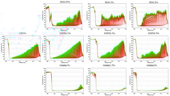 Figure 9 shows the light transmittance graph after the stability test. These lines represent the stability image obtained under the conditions of 4000 rpm centrifugation from the 0 to 2.5 h. It can be seen from Figure 3 and Figure 9 that the addition of XG reduces the stability of the emulsion, which is because the addition of XG causes flocculation in the emulsion system. When a low concentration of XG is added, the system has a bridging effect, forming bridging flocculation [], and the addition of high concentration of XG makes the system form a repulsive flocculation phenomenon [], and the system is stratified. The effect of SSPS on the emulsion is not as significant as that of XG. The addition of high concentration of SSPS can improve the stability of the emulsion, which is related to the small amount of protein in the soybean polysaccharide. The addition of gelatin can greatly improve the stability of the system. Gelatin is a protein and coconut protein can work together to make the emulsion system stable.