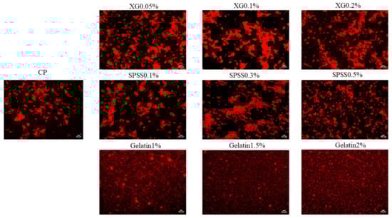 Figure 10 shows the effect of XG, SSPS, and gelatin on the microstructure of coconut protein emulsion. It can be seen that the effects of different hydrocolloids on emulsions are significantly different. When no hydrocolloid is added, there is a small amount of fat globule aggregation, indicating that 1% coconut protein cannot emulsify 10% coconut oil more completely. After adding XG, it can be seen that the fat globules have seriously aggregated, and the emulsion has flocculated []. The emulsion with SSPS also showed the same aggregation, but the degree of aggregation was lighter than the system with XG. It shows that the CP-XG emulsion system has a greater degree of flocculation than the CP-SSPS, which also indicates that the thermodynamic compatibility of CP-XG is poor. In the emulsion system with gelatin added, it can be clearly seen that the structure and particle size of the fat globules in the emulsion are uniform. Adding a certain concentration of gelatin can completely emulsify 10% of coconut oil.