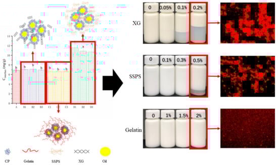 The emulsification mechanism of three different hydrocolloids and coconut protein is shown in Figure 11. The high concentration of XG can enhance the elastic film at the oil–water interface during the emulsification process, but due to the strong electrostatic effect and repulsive flocculation, the emulsion has obvious layering. The emulsion emulsified by SSPS also exhibited the phenomenon of repelling flocculation and thermodynamic incompatibility. However, the repelling effect is weaker than that of emulsions containing XG. From the concentration of the interface protein, the system with added polysaccharides did not replace the interface protein, which remained the same as before it was added. The emulsion system added with gelatin significantly increases the concentration of the interface protein. Coconut protein and gelatin stabilize the emulsion together without thermodynamic incompatibility, so the stable emulsion was obtained.