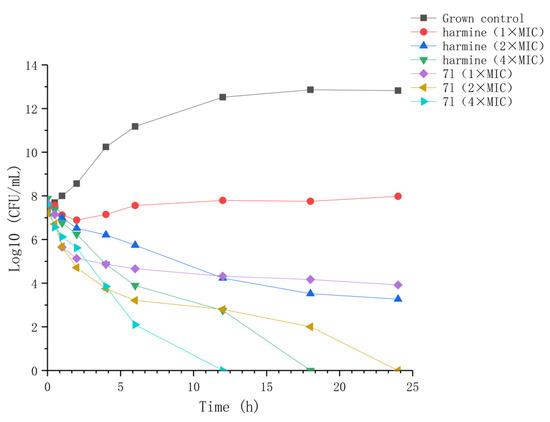 Streptococcus dysgalactiae was prepared in Mueller Hinton broth by shaking at 37 °C for 6 h. Next, 7l (1 × MIC, 2 × MIC, 4 × MIC), Harmine (1 × MIC, 2 × MIC, 4 × MIC) and normal saline (as the growth control group) were added into the bacterial suspension, and the final bacterial concentration was 106–107 CFU/mL. At a predetermined time point (0, 0.5, 1, 2, 4, 6, 12 and 24 h), viable bacteria were counted and cultured at 37 °C for 24 h [8,9]. Bacterial concentrations are expressed as Log10 (CFU/mL). The same procedure was repeated three times.
