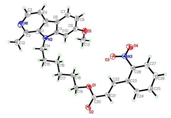 Triethylamine was dropped into 3-(4-methoxyphenyl) acrylic acid (1 mmol) acetone and stirred into the above compound until it was completely dissolved. Then, 9-(4-bromobutyl-7-methoxy-1-methyl-9H-pyridine [3,4-b] indole (3 mmol) was dissolved in the reaction solution and stirred continuously at 25 °C for 3 h. The reaction process was monitored by TLC. After the mixture has completely reacted, a solution of hydrochloric acid add to adjust the pH to 3–5 [11,12,13]. The mixture was extracted three times with ethyl acetate. The organic phase was extracted and washed with saturated NaHCO3 solution and saturated NaCl solution, respectively. The organic phase was dried on anhydrous Na2SO4 and concentrated by filtration. Compound 7l was further purified by silica gel column chromatography [14,15].
