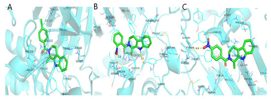 The protein receptor PDBID:2Y5Z was combined with ligands 11b, 11f and 11g in a flexible docking manner. Ligands have different binding properties at receptor binding sites. The binding diagram is preferentially drawn with the conformation with the lowest binding energy, as shown in Figure 6. Notably, 11b has no hydrogen bond when entering the active site, and the molecular energy after docking is −8.1 kcal/mol. Additionally, 11F binds to the active site of Amine oxidase [flavin containing] A protein by two hydrogen bonds, producing hydrogen bonds with lengths of 2.0 Å and 2.5 Å at the amino acid residues of Gln-215 and Tyr-444, respectively. The molecular energy after binding is −8.7kcal/mol. The N2-C13-C19 angle of the ligand structure of 11f is the same as that of the crystal structure, which is 119.9°. The dihedral angle between the C1-C7 plane and C14-C19 plane of the crystal structure is 40.3°, and the dihedral angle between the C1-C7 plane and C14-C19 plane of the ligand structure is smaller than that of crystal structure, which facilitates the formation of the hydrogen bond between 11f and Gln-215.