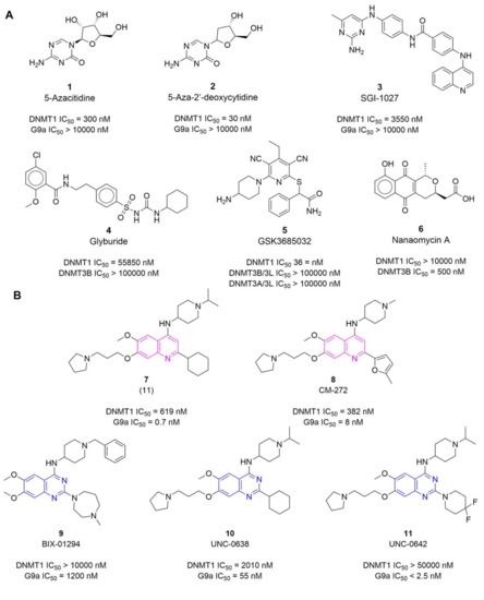 Two drugs 1 (5-azacitidine, Vidaza) and 2 (decitabine, 5-aza-2′-deoxycytidine, Dacogen) (Figure 1A) are approved for clinical use to treat the myelodysplastic syndrome [5]. The two drugs are nucleoside analogs that inhibit all three DNMTs (1, 3A, and 3B). Because of the chemical nature of these first-generation DNMT inhibitors (DNMTi), these drugs are characterized by substantial cellular and clinical toxicity, which has driven the development of non-nucleoside, novel, and more specific drugs. Currently, more than 400 non-nucleoside compounds have been tested against at least one DNMT (mostly DNMT1) [20]. Figure 1 shows representative structures of DNMTi and compounds (1–11) associated with the demethylating activity of DNA. Of note, there is a limited number of selective inhibitors inhibiting DNMTs disclosed so far. For example, 6 (nanaomycin A) (Figure 1A) is a selective inhibitor of DNMT3B (do not inhibit DNMT1) and reactivates silenced tumor suppressor genes in human cancer cells [21]. Recently, 5 (GSK3685032) (Figure 1) was disclosed as the first selective inhibitor of DNMT1 that reduces global methylation, increases expression of target genes, and has antitumor efficacy in acute myeloid leukemia xenograft models [22]. Other related compounds are DNM1-selective inhibitors that reduce global methylation and increases HbF expression, offering the potential for use in treating sickle cell disease [23]. Furthermore, dual inhibitors of DNMT and other epigenetic targets such as G9a and histone deacetylases (HDACs) are emerging as part of a current trend to develop multi-epi-target inhibitors [24,25,26].