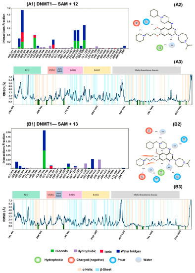 Molecular dynamic results of compounds 12 and 13 against DNMT1. 300 ns were produced peer each compound. The (A1,B1) panels show the interactions between ligands and the DNMT1 structure in the presence of S-adenosyl-L-methionine (SAM). Additionally, panels (A2,B2) show the representative key interaction during the last 30 ns of molecular dynamic productions. Finally, panels (A3,B3) illustrate the conformational changes (RMSD values) on different key domains on DNMT1.
