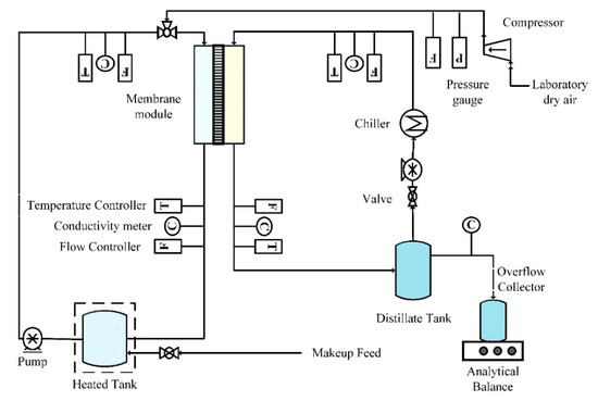In this study, direct contact membrane distillation (DCMD) configuration was used with modified air sparging technique. It was named as AS-MD (air sparged membrane distillation). AS-MD experiments were conducted using a closed-loop bench-scale membrane test unit (Figure 1). The disk-shaped module had an inner diameter of 4.2 cm and an active contact area of 13.85 cm2. Peristaltic pump (Cole Parmer, model 77200-52, Vernon Hills, IL, USA) was used to circulate feed water mixture through the membrane module and was recycled. The sparged air velocity was measured by a digital flow meter (Kelly Pneumatics, Inc., Newport Beach, CA, USA). The heating element and the temperature sensor (K-type, Cole Parmer) were connected to a temperature control unit that was used to regulate the temperature of the feed solution. The overflow of permeate water was collected as flux weighed on an analytical balance. Cold water was circulated in the condensing coil from a chiller to collect permeate vapor with recirculating permeate. Laboratory dry air supplied in the fume hood was sparged in the feed side. The electrical conductivity and turbidity of the distillate was continuously monitored using a portable pH/conductivity meter (Cole Parmer, Vernon Hills, IL, USA) and UV 2018.