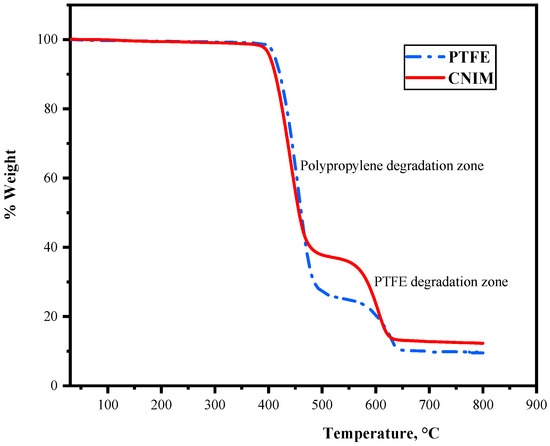 Thermogravimetric analysis (TGA) was used to analyze the stability of the control PTFE membrane and CNIM at higher temperatures. The TGA curves are shown in Figure 2. It is observed that the initial thermal decomposition of the membrane began at 350 °C (degradation of the PP support layer), followed by the degradation of the PTFE active layer at 500 °C. The degradation characteristics of the membrane showed the applicability of the membranes at higher temperatures.