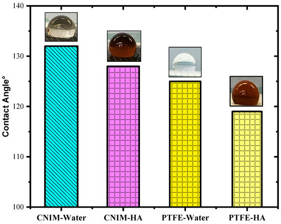 The contact angles of DI water and 100 mg/L aqueous HA solution on the membrane surface, along with their images, are presented in Figure 3. The presence of CNTs resulted in the alteration of the contact angle of the drops on the PTFE membrane. In the case of deionized water, the contact angle for the plain PTFE membrane was 125° which decreased to 119° for the 100 mg/L HA solution. While for the CNIM membrane the DI water contact angle was 132° and 128°, for the HA solution it was at room temperature. The reduction in the contact angle for humic acid solution in CNIM attributed to the functionality of carbon nanotubes. The finding of the experiment was that the incorporation of CNTs increased the contact angle for water, rendering higher hydrophobicity, which indicated lesser wetting of the membrane surface.
