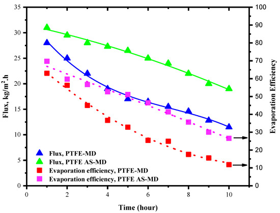 The flux and evaporation efficiency for control PTFE membrane in regular and air sparged mode is shown in Figure 4. The concentration of the HA was kept at 100 mg/L and the experiment was run for 10 h. In case of regular membrane distillation shown in Figure 4, the flux of the PTFE membrane was found to be 28 kg/m2⋅h for the first hour; after that, the flux started declining with time. This is due to the deposition of HA layer over the membrane surface. The deposition amount and propensity increased with time. After running for a cycle of 10 h the flux declined by 60% of its initial value and finally reached a value of 12 kg/m2⋅h. In the meantime, the evaporation efficiency was also affected by the lesser vaporization and vapor molecules available for permeation. As a result, the evaporation efficiency declined from 72.3% to 10.12%. This steep decline in evaporation efficiency could be the impact of reduced vapor permeation through the membrane to the permeate side and possible heat loss because of fouling.