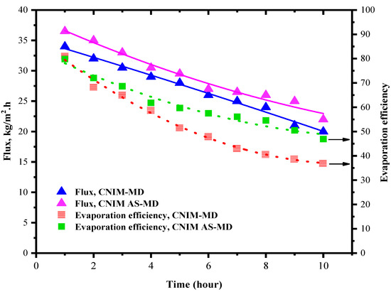 Flux and evaporation efficiency of 100 mg/L HA solution on CNIM membrane.