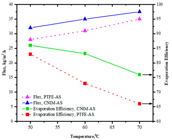 The effect of temperature change on flux and evaporation efficiency (EE) is evaluated and shown in Figure 6. The experiments were performed at 50, 60, and 70 °C temperature for both the control PTFE and CNIM membrane with regular and air sparging modes of MD. Overall, the flux increased for increasing temperature for both the PTFE and CNIM membrane in either condition, whereas the EE showed opposite trend to flux. The evaporation efficiency declined as the temperature increased, which could be due to the loss of heat from the system at higher temperature. For a temperature change of 20 °C from 50 to 70 °C the flux of PTFE membrane with air sparging reached 35 kg/m2⋅h from 28 kg/m2⋅h, while for CNIM membrane the change was 32 to 37.5 kg/m2⋅h. However, the EE for CNIM membrane dropped by 11.6% for temperature change and for PTFE membrane it was 20.4%.