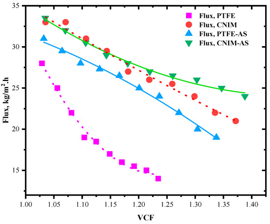 The trend of flux and evaporation efficiency depends on the concentration of the HA solution. If the concentration is increased, the subsequent effects are visible in their flux values. Here, the concentration effect is expressed as volumetric concentration factor. The VCF is defined as follows [43]:
