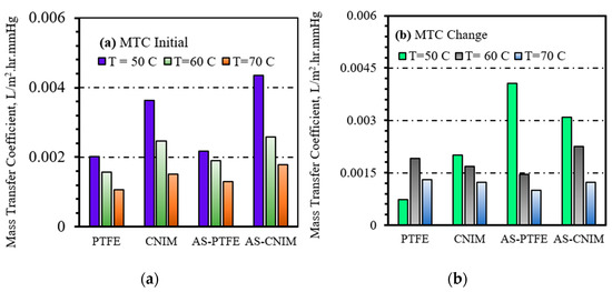 Mass transfer coefficient (MTC) for MD and AS-MD for control PTFE and CNIM membrane. (a) MTC initial. (b) Change in mass transfer coefficient in membrane -HA system.