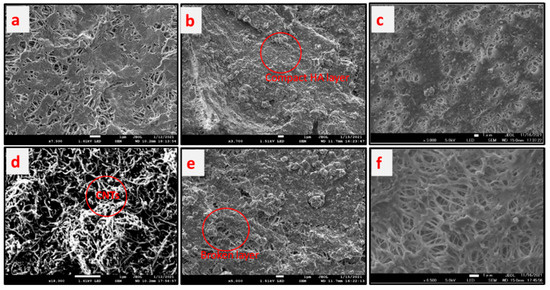 Scanning electron micrograph of membranes and fouling layer. (a) Pristine PTFE membrane. (b) Humic acid layer over PTFE. (c) Thin layer of humic acid in air sparging MD. (d) Carbon nanotube immobilized membrane (CNIM). (e) Broken humic acid layer over the CNIM membrane. (f) Cleaned CNIM surface with air sparging.