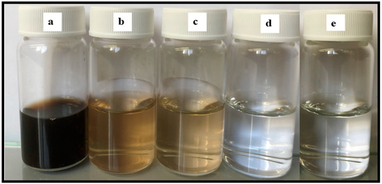 Rejection of HA solution and permeate turbidity: (a) feed humic acid solution of 100 mg/L. (b) Permeate of PTFE, MD. (c) Permeate of PTFE, AS-MD. (d) Permeate of CNIM, MD. (e) Permeate of CNIM, AS-MD.