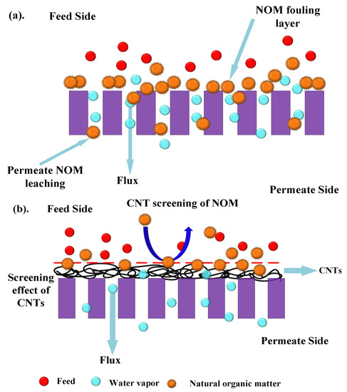 Fouling is an important consideration in MD where adsorption in pores and plugging are the major fouling mechanisms [23,25,26,27,28]. The propagation of fouling leads to the lowering of hydrophobicity and wetting of the membrane that induces passing of the liquid through the membrane then the vapor molecules [3,29,30]. Fouling also leads to temperature and concentration polarization and decrease in flux, thus lowering the thermal efficiency of the MD process. Therefore, the mitigation in fouling in the presence of humic acid is an important consideration for MD. Fouling reduction in MD has been carried out by changing the flow regime across the membrane surface [31], use of antiscalants [20], and regular cleaning. We have also shown that immobilization of carbon nanotubes can reduce fouling in CaSO4 and CaCO3 contained water where the CNTs (carbon nanotubes) serve a screen that prevent the deposition of large particles [20,32,33].