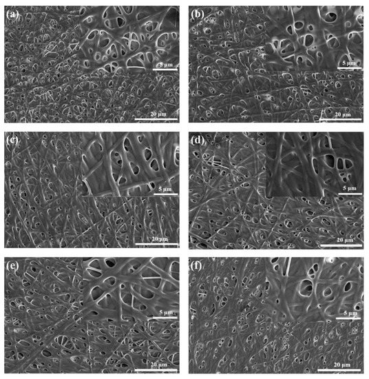 The whole sample preparation process was carried out at 25 °C and 50% relative humidity. After vacuum drying for 48 h, the fiber membranes were cut into 0.5 cm × 0.5 cm squares and coated with a thin layer of gold for SEM observation. The micro-morphology of each group’s membranes was photographed at 5000× and 10,000×. We have added a description of the experimental conditions in the relevant place of the revised manuscript. The morphology of the nanofibrous membranes was observed under scanning electron microscopy (SEM, S-4700, Hitachi Group Corp., Hitachi, Japan). Meanwhile, randomly selected areas were cut into squares and coated with a thin layer of gold.