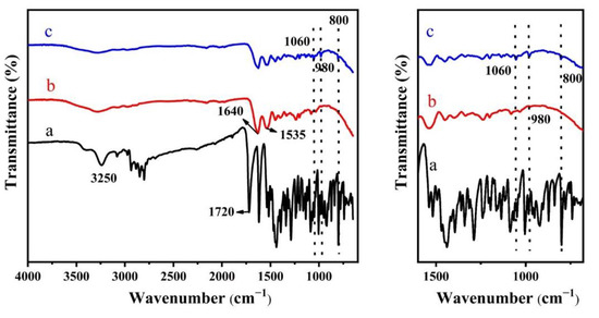 Infrared spectra of levofloxacin and different levofloxacin-containing gelatin fiber membranes: (a) levofloxacin drug, (b) crosslinked gelatin/genipin membrane, (c) crosslinked gelatin/genipin membrane with 5 wt% levofloxacin.
