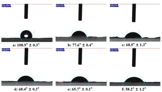 Static water contact angle of gelatin/genipin membranes with levofloxacin content in (a) 0 wt%, (b) 1 wt%, (c) 2 wt%, (d) 3 wt%, (e) 4 wt%, (f) 5 wt%.