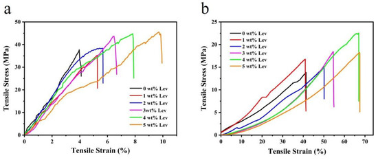 In this experiment, the mechanical tensile test was performed on dry and wet gelatin/genipin/levofloxacin nanofiber membranes because the TM repair underwent a wet transition during use. Figure 4a shows the typical stress-strain curves of the membranes (dry) with a different levofloxacin content. With the addition of levofloxacin, tensile strength and elongation at the break of the membranes have increased. Similar results are also exhibited in the wet membranes and are more pronounced, as shown in Figure 4b. Table 1 displays the date of tensile strength and elongation at the break of the membranes in dry/wet state. At the same time, it also exhibits enhanced tensile strength and elongation at the break when levofloxacin content increases. The introduction of the polar group -F may increase the intermolecular force and strength, as seen in the structure of levofloxacin (Figure S3, which has been added in the Supplementary Materials) [34]. Therefore, the addition of levofloxacin increased the intensity slightly.