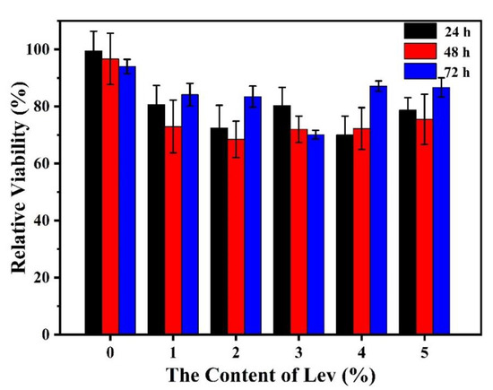 Cell viability experiments were performed on the membranes using fibroblasts that are component parts of a human TM. According to Figure 5, the cells have adhered and proliferated on the gelatin/genipin membranes. This result is similar to our previous work [14], which means the scaffolds can provide an environment to support the formation of mineralized tissue. However, with the addition of levofloxacin, the membranes show an inhibitory effect on the cells at 24 h. It was found that the relative growth activity of fibroblasts decreases based on the five groups of gelatin/genipin/levofloxacin, which indicates that the addition of levofloxacin is not beneficial to the growth of fibroblasts at 24 h. Figure S4 provides the SEM photographs of human skin fibroblasts fixation inoculated on crosslinked gelatin/genipin membrane with 5 wt% levofloxacin for two days. In comparison, after 72 h of cultivation, the relative growth activity of most groups has increased. Therefore, the gelatin/genipin/levofloxacin still has the function of supporting cellular activity over a long culture time.