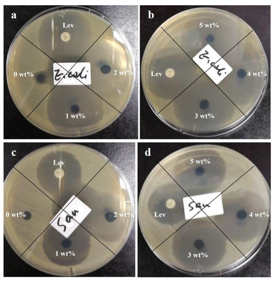 Antibacterial circle diagram of gelatin/genipin/levofloxacin membranes in (a,b) Escherichia coli (E. coli) and (c,d) S. aureus (Sau).