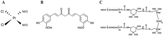 The molecular structure of (A) Cisplatin (B) Curcumin and (C) mPEG urethane gemini surfactant nanoparticle.