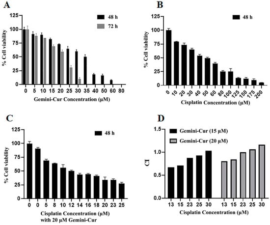 Effect of Gemini curumin and cisplatin on the viability of MDA-MB-231 cells in vitro. MDA-MB-231 cells were grown and treated with Gemini-Cur (A), Cisplatin (B) and Gemini-Cur/Cis (C,D). 15 and 20 μM of Gemini-Cur combined with serial concentrations of cisplatin. Data represent mean ± standard deviation of three independent experiments. CI: Combination index.