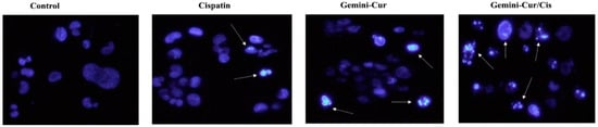 Morphological observation of apoptosis in Gemini-Cur and cisplatin treated cells by Hoechst staining in 48 h. Control shows a uniform exposure of live cells to stain. The color intensity and the number of cells indicating apoptotic features are significantly increased in treated groups. Arrows indicate apoptotic cells with cell shrinkage, nuclear fragmentation and DNA condensation. Magnification: 200×.