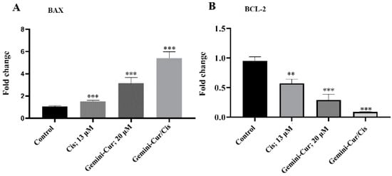 Quantitative analysis of the expression of apoptotic genes by real-time PCR. Relative expression for BAX (A) and BCL-2 (B) in MDA-MB-231 cells. Values represent mean ± standard deviation of three independent experiments; ** p < 0.01 and *** p < 0.001.