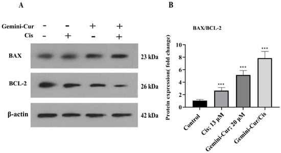 (A) Western blotting for BCL-2 and BAX (A) proteins. β-actin was used as internal control. (B) Data analysis showed that the protein ratio of BAX/BCL-2 is significantly increased in the cells treated with Gemini-Cur/Cis compared to the groups of Cis and Gemini-Cur. Values represent mean ± standard deviation of three independent experiments. *** p < 0.001.