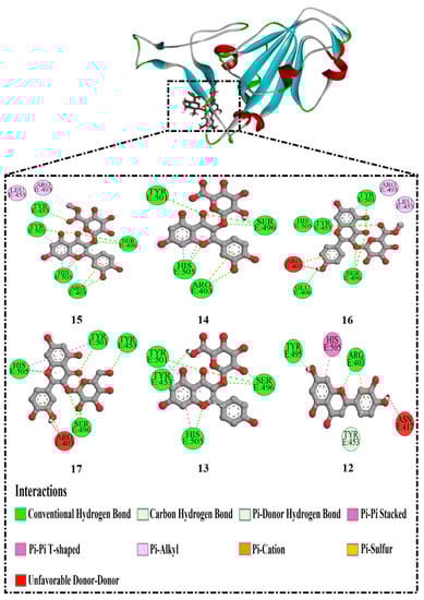 To recognize the other types of interactions, two-dimensional representations of the interactions of these six potent compounds with the main active site residues are displayed in Figure 1. It is worth mentioning that compound 15 exhibited a pi–alkyl interaction with LEU455 (4.96 Å) and ARG493 (4.17 Å). Moreover, it also formed a pi–cation interaction with ARG403 (4.92 Å), as well pi–pi stacked and pi–pi T-shaped with TYR501 (4.24 Å) and HIS505 (4.92, 4.99 Å), respectively. In the case of compound 14, it formed two extra types of interactions, pi–pi T-shaped with HIS505 (4.92, 5.05 Å) and a pi–cation interaction with ARG403 (4.90 Å). Similar to compound 15, compound 16 formed pi–alkyl, pi–pi stacked, and pi–cation interactions with the same residues but different bond lengths. Excluding pi–alkyl interaction, compound 17 showed the same types of interactions that existed in compound 16. Notably, compound 13 was the only one that exhibited no pi–cation interaction. Compound 12, the lowest-ranking of the six compounds in terms of docking score, showed only two additional interactions other than hydrogen bonding. It is worth highlighting that residues ARG403, TYR501, and HIS505 favored the formation of pi–cation, pi–pi stacked, and pi–pi T-shaped interactions, respectively, with RBD residues.