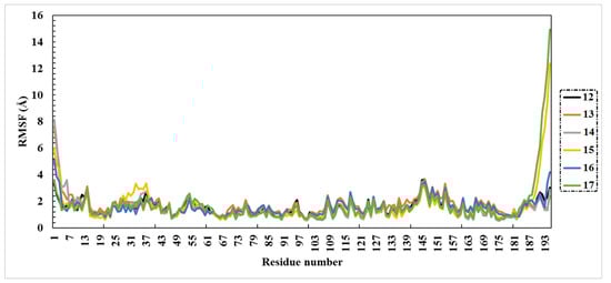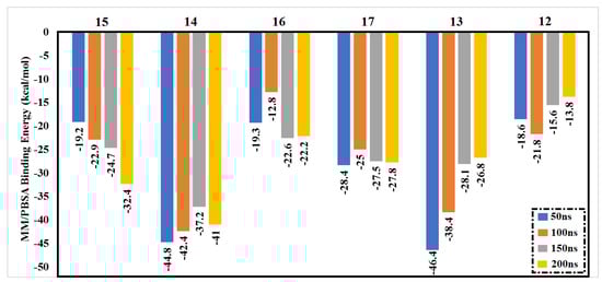 Notably, compounds 14 and 13 showed similar binding energies over 50 ns with values equal to −44.8 and −46.4 kcal/mol, respectively. Furthermore, compound 15 and compound 16 showed identical values of binding energy. Interestingly, compound 12, the lowest of the six compounds in terms of docking score, also exhibited the lowest binding energy, with a value equal to −18.6 kcal/mol.