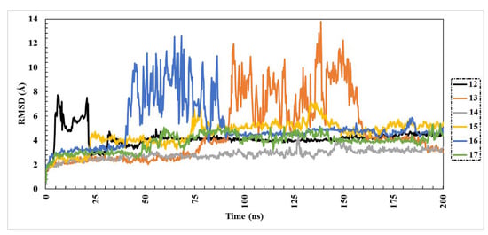Obtained results of RMSD analysis over 200 ns MD simulation are plotted in Figure 3. It is worth mentioning that compound 14 exhibited overall stability compared to the other five compounds, with an average RMSD value of 2.84 Å. Comparatively, the RMSD values of the other compounds were relatively high. These results showed that compound 14 was tightly bound and had no effect on the overall topology of Omicron.