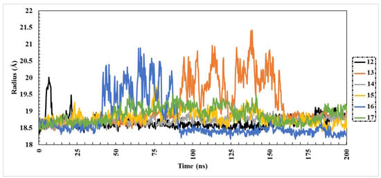 In order to assess whether the protein–ligand complexes were stably folded or not, radius of gyration (Rg) analysis was performed over the 200 ns MD simulations. Values of Rg give an indication of the compactness of the protein structure within the system [] A more compact protein structure can be observed in the case of lower values of Rg. During the 200 ns simulation course, all compounds exhibited acceptable behavior of Rg, which can be observed in Figure 5. The range of Rg values for the six compounds was from 18.68 to 19.14 Å. What also can be noticed from Figure 5 is that compounds 14 and 15 showed constant Rg behavior during the simulation, which indicates high compactness of the protein structure.