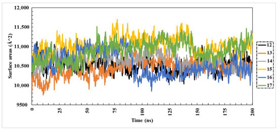 Solvent-accessible surface area analysis (SASA) was performed to represent the area of protein exposed to solvent. The averaged SASA values of the six structures were 10,501, 10,428, 106,30, 11,007, 10,553, and 10,886 for compounds 12 to 17, respectively. Despite the compact folding of 7QNW, the increase in SASA in compound 15 compared to the other compounds indicated obvious conformational changes due to ligand binding. Consequently, SASA may provide details about the protein’s ability to interact. As shown in the data in Figure 6, all six compounds exhibited relative stability and compactness over the course of the 200 ns MD simulation.