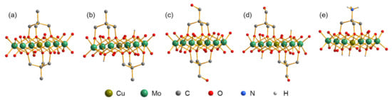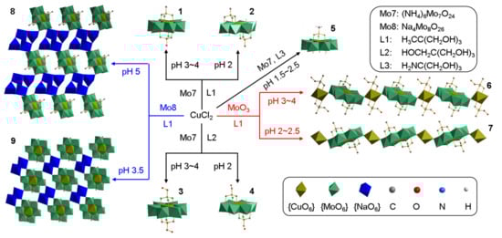 - Wang, Y.; Li, B.; Qian, H.J.; Wu, L.X. Controlled triol-derivative bonding and decoration transformation on Cu-centered Anderson-Evans polyoxometalates. Inorg. Chem. 2016, 55, 4271–4277. [Google Scholar] [CrossRef] [PubMed]