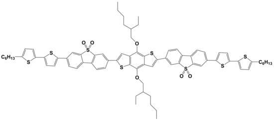 In this work, a novel π-conjugated thiophene-containing oligomer with two DBTSO electron-accepting unites and a D-A-D-A-D architecture (Figure 1) has been synthesized. It is 2,6-bis{[4-(7-n-hexylthiophen-2-yl)thiophen-2-yl]-(dibenzothiophene-5,5-dioxide-3,3′-diyl)}-bis((2-ethyl-hexyl)oxy)benzo[1,2-b:4,5-b′]dithiophen (BDT(DBTOTTH)2), which has a benzo[1,2-b:4,5-b′]dithiophene donor core, two DBTSO acceptor intermediaries and two end-capped hexyl dithienyl donor units. Its photophysical properties, energy band gap, molecular orbital energy levels and thermal stability were then characterized using Ultraviolet-visible (UV-vis), photoluminescence (PL) spectra, cyclic voltammetry (CV) and thermogravimetric analysis (TGA). Considering that the oligomer has a large linear π-conjugated and D-A-D-A-D structure, and a good solubility deriving from of hexyl and 2-ethyl-hexyloxy groups, it would be a solution-processable semiconductor material. Therefore, the oligomer BDT(DBTOTTH)2 was further used to fabricate an OFET device by a simple spin coating technique, and a mobility of 1.6 × 10−3 cm2/Vs was obtained.