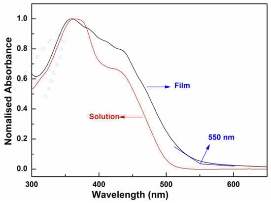 As shown in Figure 4, the oligomer in dilute CH2Cl2 solution has the absorption maximum value at 359 nm and a broad shoulder peak at 425 nm, whereas in the thin film, the absorption band of the oligomer becomes relatively broader and less structured. The maximum absorption peak displays a blue-shift about 7 nm relative to that of its corresponding solution. The blue-shift should attribute to the formation of the H-aggregate in the solid state [37], which is usually observed in excellent semiconductor materials. In H-aggregates, since the molecules are closely π-stacked in a face-to-face alignment, the neighboring molecules also interact in the ground state [38]. The absorption onset (λedge) of the oligomer film in UV-Vis spectra is 550 nm. According to Equation (1),