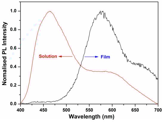 the optical band gap of the oligomer was calculated to be 2.25 eV. This band gap is moderate, and very close to that of pentacene (2.2 eV), which is the most well-known OFET material [39]. The pronounced changes in the absorption spectra are a result of the delocalization of the exciton within co-facial stacks induced by the π-π interactions, which is also evidenced by a related red-shift of the PL spectra (Figure 5). The emission spectrum of the oligomer BDT(DBTOTTH)2 shows strong blue-green fluorescence in the diluted solution, and exhibits a maximum emission peak at 464 nm with a broad shoulder peak ranging from 540 to 610 nm. The emission spectrum of the oligomer BDT(DBTOTTH)2 in the thin film has a similar pattern as that in solution except for an obvious red shift. The maximum emission peak of the oligomer in the film is located at 578 nm. Compared with that in the solution, the emission spectrum is bathochromically shifted by 114 nm.