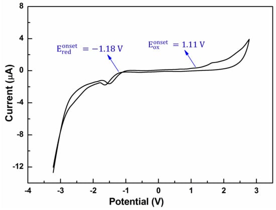 To understand the charge transport properties, and to determine the HOMO and lowest unoccupied molecular orbital (LUMO) levels of the oligomer, the redox properties of the oligomer BDT(DBTOTTH)2 were investigated by cyclic voltammetry (CV). As shown in Figure 6, the oligomer shows an irreversible oxidation wave, and has an onset oxidation potential of 1.11 eV. It is well known that the HOMO levels of organic compounds can be calculated according to their onset oxidation potentials and the empirical Equation (2).