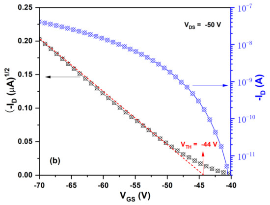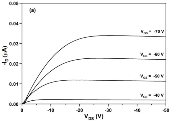 Figure 8a shows the relationships between the drain-current (ID) and drain-source voltage (VDS) at different gate-source voltages (VGS) from −40 to −70 V for the OFET device using OTS/SiO2 as the insulating dielectric layer. The function of the transistor with the negative gate voltage range suggests that BDT(DBTOTTH)2 is a p-type semiconductor material. The output characteristics show a good saturation behavior and clear saturation currents that are quadratic to the gate bias. Furthermore, as a more negative VGS was used, more holes were induced in the accumulation layer of the organic semiconductor. As a result, an increased IDS was achieved. The most critical properties of an OFET device are the charge mobility (μsat) and Ion/Ioff current ratio. The charge mobility is the average drift velocity per unit electric field, and it can be calculated in the saturation regime using following Equation (4),