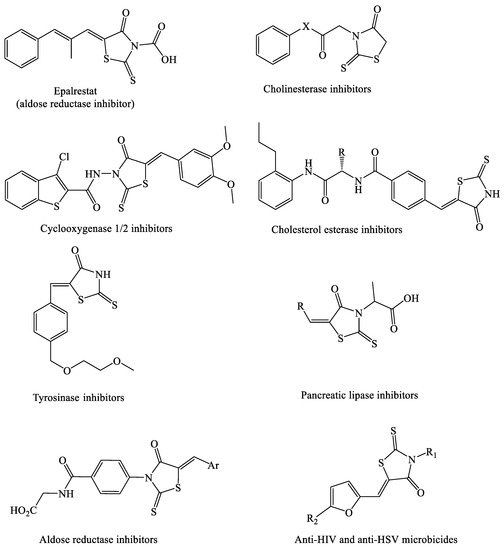 Rhodanine and related compounds are known as scaffolds or templates to discover and develop drugs [1]. In the drug market, Epalrestat is known as a rhodanine acetic acid derivative to treat diabetic peripheral neuropathy. Epalrestat was reported to be generally used for a few adverse effects such as nausea, vomiting, and elevation of liver enzyme levels [2]. Rhodanine compounds have shown antidiabetic, anti-HIV, anti-infective, anti-Alzheimer, anticancer, antibacterial, anti-tubercular, and antifungal activities [3]. Compounds with a rhodanine structure have shown a broad range of biological activities such as carbonic anhydrase and acetylcholinesterase inhibitors [4], 15-lipoxygenase inhibitors [5], cyclooxygenase 1/2 inhibitors [6], anti-anxiety and anti-depressant [7], IKKβ-inhibitors [8], cholesterol esterase inhibitors [9], tyrosinase inhibitors [10], antiangiogenic [11], pancreatic lipase inhibitors [12], α-amylase inhibitors [13], aldose reductase inhibitors [14], anti-HIV and anti-HSV microbicides [15], and Dengue virus protease inhibitors [16], respectively (Figure 1).