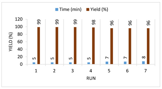 Furthermore, to evaluate the feasibility of IL (2) reuse, the synthesis of 5a was selected for this assignment. The reusability of the IL (2) was studied by repeating the model reaction under optimal conditions (Scheme 2). The obtained product was separated through simple filtration following every run, and the IL was retrieved by removing water under vacuum and reused in the next run. The IL was evidenced to be highly stable (1H NMR after the seventh run was the same as the original one) at optimum conditions and could be recycled up to seven cycles without a considerable loss of potency (Figure 2).