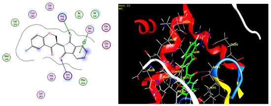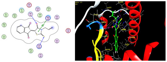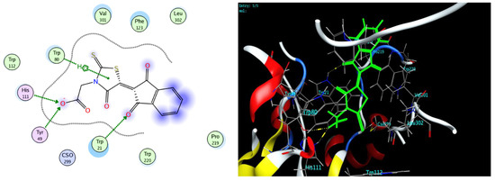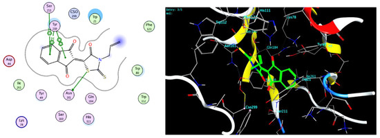 Enzyme-ligand docking was investigated for three prepared derivatives 5c,d, 12b to predict the binding interactions between the novel prepared derivatives and AKR1B10 and PPARγ protein that resulted from the protein data bank (PDB: 4JIH, 7E0A), respectively, by Molecular Operating Environment (MOE®) version 2014.09 (Table 5). The investigated derivatives were successfully docked into the active sites of AKR1B10 and PPARγ protein compared with Epalrestat as a reference compound (Figure 4).