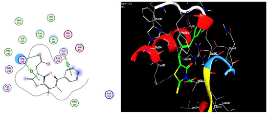 Docking data for compound 5d with PPARγ showed that both the carbonyl-oxygen and the sulfur were hydrogen-bonded with SER 342 and LYS 265, respectively, and hydrophobic interaction with ARG 288 (Figure 7).