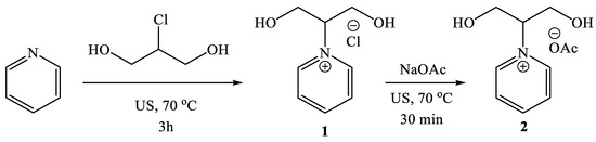 In a closed vial, a mixture of pyridine (0.85 mL, 1.0 mmol) and 2-chloropropane-1,3-diol (0.11 g, 1.0 mmol) was sonicated at 70 °C for 3 h. The obtained crude product was purified by recrystallization from acetonitrile to produce the pure product (99%) as white crystals (1). Then, to the residue of 1 in EtOH (15.0 mL), NaOAc (0.082 g, 1.0 mmol) was introduced. The resulting solution was sonicated at 70 °C for 30 min, following which the solvent was removed under reduced pressure to yield the corresponding IL (2) with an almost quantitative yield.