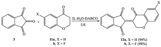 Interestingly, chroman-4-ones (11a,b) performed effective and potent reactions with ninhydrin, yielding the condensed compounds 12a and 12b in 94 and 98% yields, respectively (Scheme 6). The molecular structures of all the newly assembled compounds (5, 8, 10, and 12) were evaluated utilizing IR, NMR spectroscopy as well as HRMS (see Supplementary Materials).